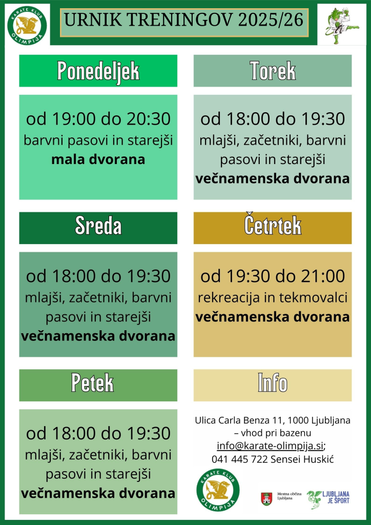 • tor – od 18:00 do 19:30 v veliki borilni dvorani na Kodeljevem – za